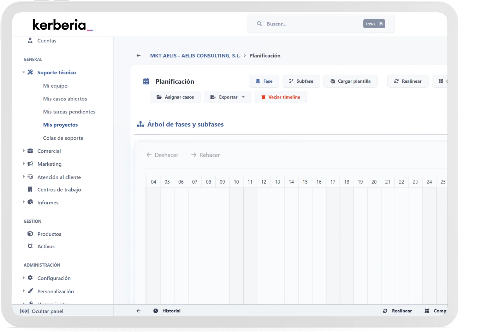 El módulo de Proyectos de kerberIA permite estructurar cada proyecto en fases, planificar tareas, vincular casos, reservar servicios y controlar el tiempo imputado por el equipo.